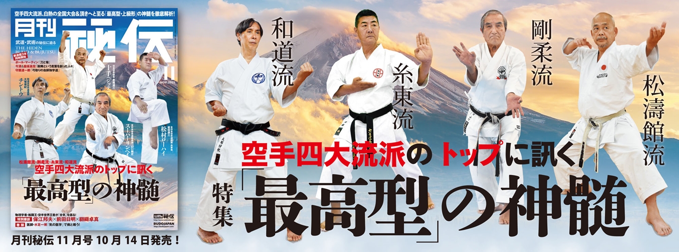 特集第1章は、松濤館流の上級形について、日本空手協会の泉屋誠三師範に伺った。「一本勝負」を旨とする空手協会のスタイルを守り続けていくためには、形はどうあるべきなのか? その問題意識を踏まえた上で、現在の形競技の課題をあげていただくとともに、松濤館の上級形の中から「雲手」「十手」「抜塞小」を実演で示してもらいつつ、そのポイントを解説いただいた。