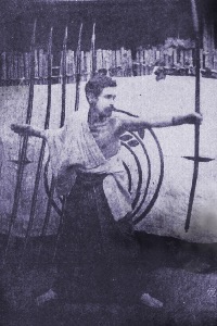 江戸時代後期~明治時代にかけての尾州竹林派の弓術家。天覧[明治19(1886)年]において星兜を射抜いた名人。13歳で六分五厘(約26㎏)、18歳で六分八厘(約28㎏)、先生からもらった七分三厘(約30㎏)の弓が弱く感じられたという。明治12(1879)年、上京して神田今川小路に道場を開く。明治18(1885)年には吹上御殿で八分五厘(約35㎏)で一手、寸弓(約40数㎏)で一手的前を行う。明治20(1887)年には伏見宮で愛用の八分矛詰り、約30数㎏の弓で信家が鍛えた星兜を三寸ほど射抜く。明治34(1901)年64歳で病没。