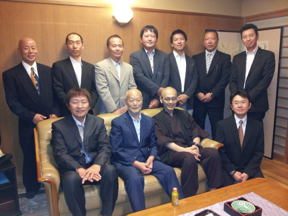 錦戸無光総師範を囲むお弟子さんたち(2013年5月18日)。前列左から、古賀武光師範、錦戸無光総師範、故・大崎司善師範、松村浩道師範。後列左から、後藤武水師範、関本菊臣師範、豊田浩司師範、寺田守宏師範、松田賢一師範、甲斐田裕光師範、古澤裕二師範代。