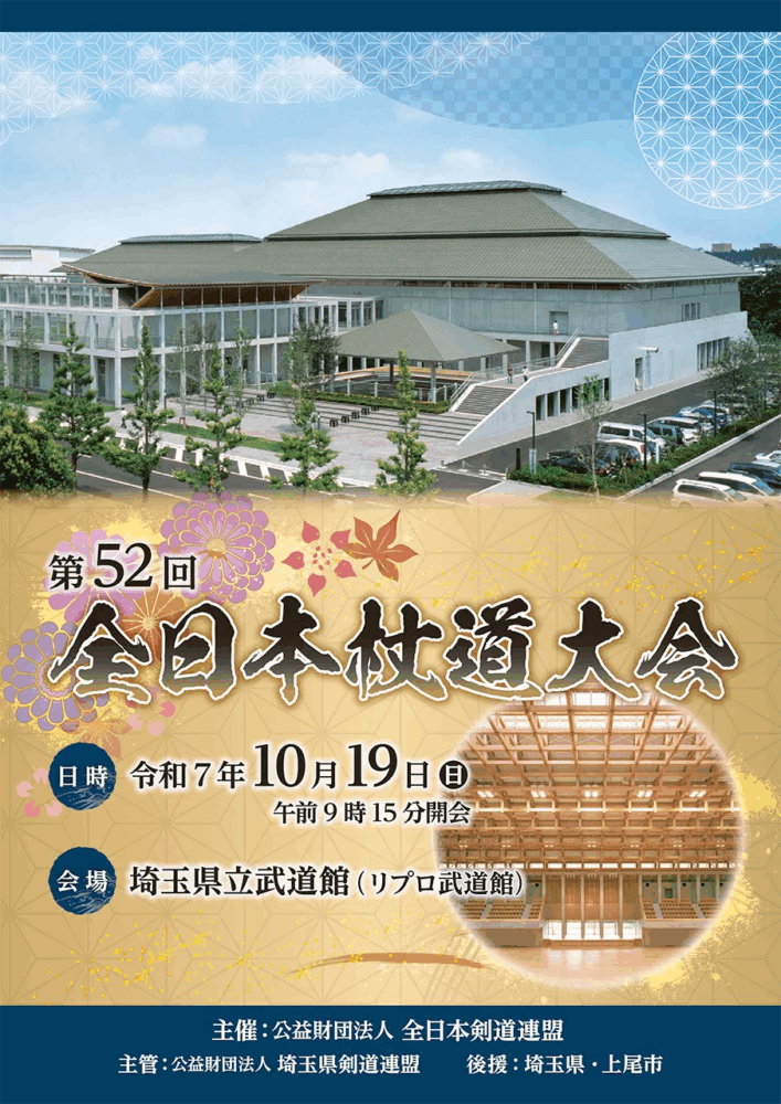 公益財団法人 全日本剣道連盟主催による「第52回 全日本杖道大会」が、10月19日(日)に埼玉県立武道館(リプロ武道館)で開催されます! 本大会は全日本剣道連盟杖道の普及徹底を期すため、日頃の稽古の成果を競い合う大会であり、各地より参集した選手の親睦を深める場とし、もって斯道のより一層の発展を期すものです。ぜひ現地にてご観覧ください!