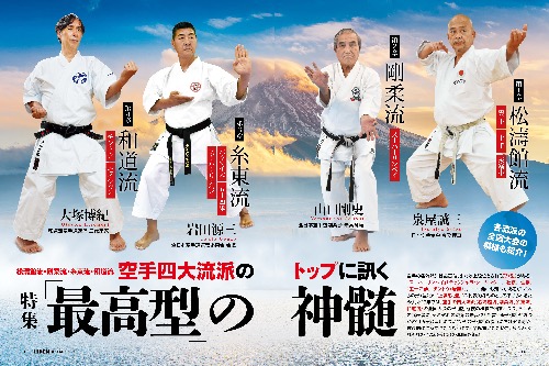 特集は「空手四大流派のトップに訊く 『最高型』の真髄」。空手の四大流派(松濤館流、剛柔流、糸東流、和道流)の全国大会の形(型)競技の模様を踏まえつつ、各会派の代表者に、それぞれの流派の最高位とも言える形(型)や幾つかの“上級形(型)”について、その形(型)の流派における役割や、技術的に注意すべき点などについて解説いただいた!