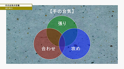 手の合気とは、張り(手を張る)、合わせ(自分の手を相手の掌に合わせる)、攻め(指先から相手の腰・肩を攻める)という3要素を組み合わせ、相手の掴んでいる力を利用する技術